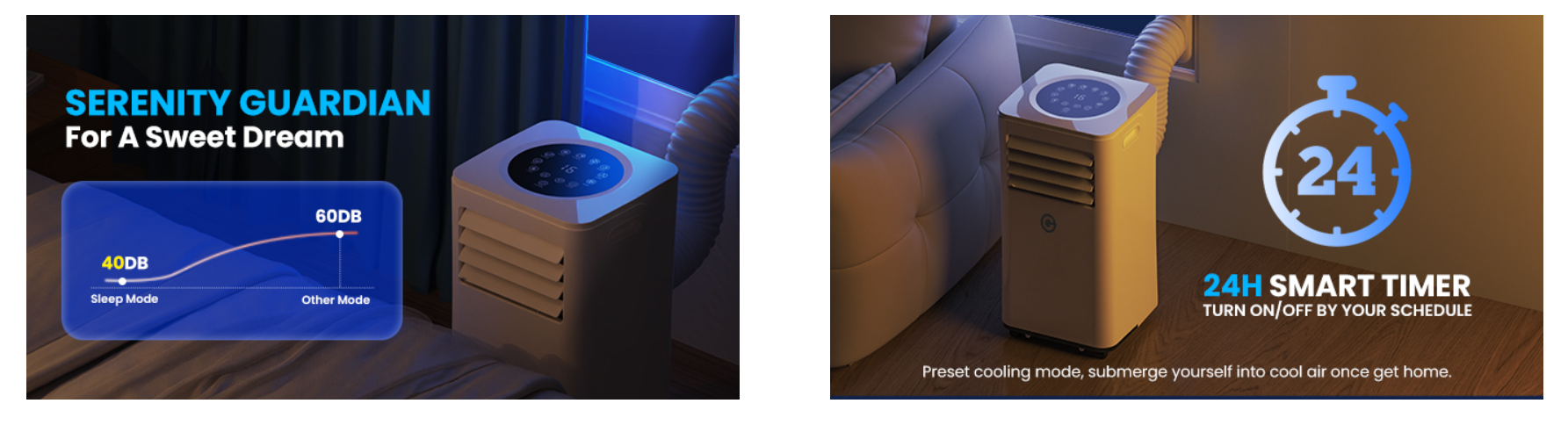 • 🌛【Guard Your Tranquil Slumber】Enjoy whisper-quiet serenity with our ultra-quiet air conditioner. Our air conditioner is equipped with a high-quality air compressor and multi-layer cottons, serving as indispensable noise-reducing parts. Drift off into a tranquil slumber under sleep mode with light off and lower noise. Immerse yourself in a childlike sleep under our sleep mode's gentle hum below 40 DB, ensuring a ultra-quiet undisturbed rest every time.