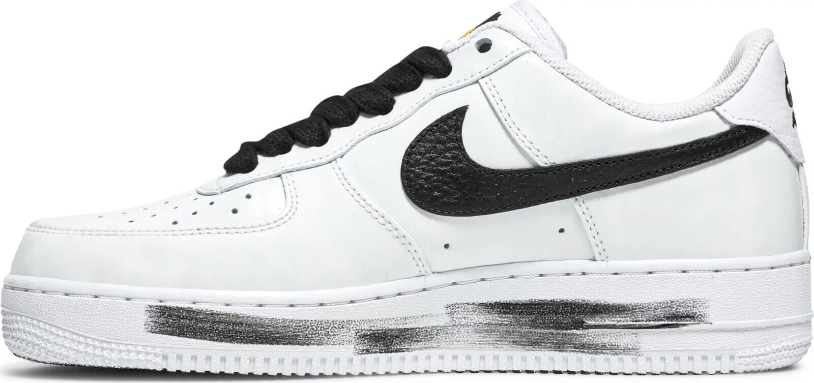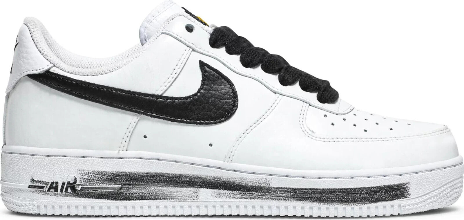 Year Of Release: 2020The G-Dragon x Nike Air Force 1 ‘07 ‘Para-Noise 2.0’ is the follow-up colorway to the 2019 Air Force 1 collaboration undertaken with the Korean hip hop star. This pair essentially flips the color blocking of the original, featuring a black Swoosh on a white leather upper, its top layer designed to wear away and reveal custom artwork created by G-Dragon. Additional flourishes include decorative eyelet pins, an embroidery daisy atop the tongue and crude brushstroke effects on the midsole.